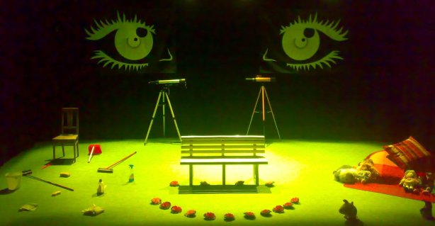Due occhi, guardano dentro la scena, guardano due famiglie che credono di conoscere la propria intimità, di saper condurre una vita familiare al modo più opportuno, e invece non sanno vedere. Hanno un binocolo puntato sulla casa di fronte, parlano e sparlano degli altri, non capiscono di essere proprio loro il vero obiettivo, il vero bersaglio. Come la parabola biblica della trave e la pagliuzza, è questo il sentimento alla base di Nel giardino.