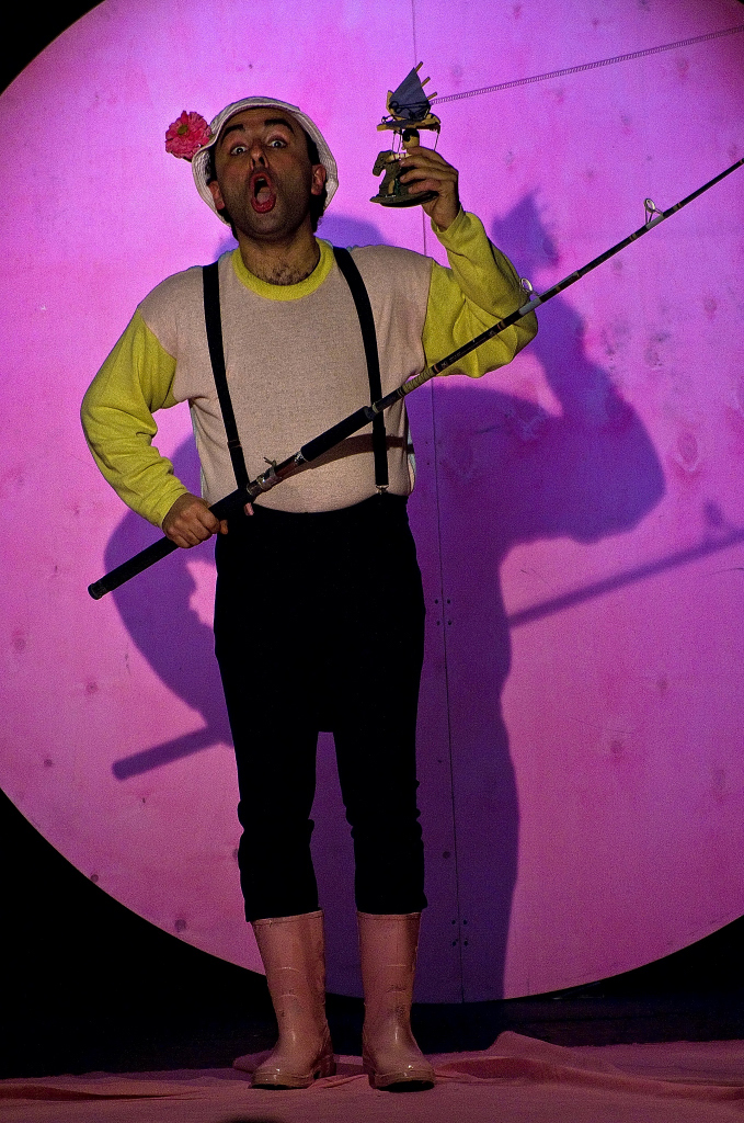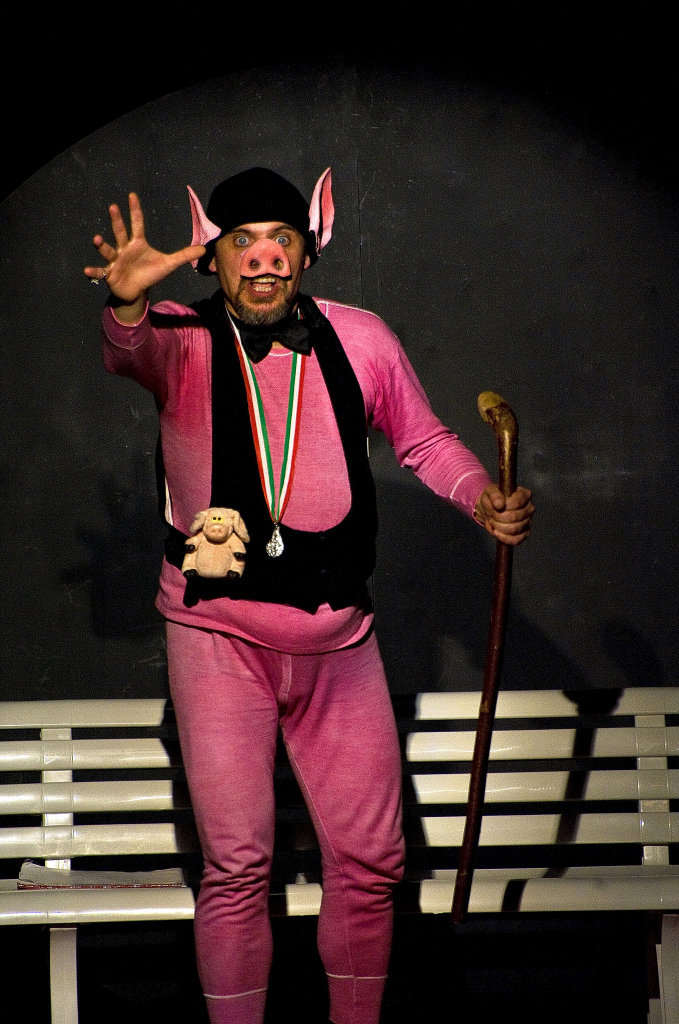 In scena ci sono tre personaggi surreali e archetipici: la Donna, il Maiale, il Pescatore. L’intera piece si gioca sul serrato dialogo tra i tre, che illumina attimo dopo attimo l’assurdità del contesto, del linguaggio, dell’essere personaggi. L’inizio è folgorante: in un istante le battute attivano una macchina scenica dai perfetti tempi comici e teatrali, l’alto si mescola al basso, l’incomunicabilità tra i codici e i personaggi è un detonatore sottile e potente. Claudio Di Loreto – un eccellente maiale – è superbo nel ruolo di regista in scena: detta i tempi, incalza gli altri personaggi quando l’attenzione cala […] passa con aplomb da colte disquisizioni a improvvisi nonsense […]. È evidente la sua consonanza con le corde del testo e dell’autore, e non stupisce scoprirlo co-fondatore della compagnia OlivieriRavelli: butta via le battute più impervie senza precluderne la comprensione, mantiene eleganza in quelle più grevi, incarna il delicato equilibrio tra il meccanismo comico e la struttura significante.